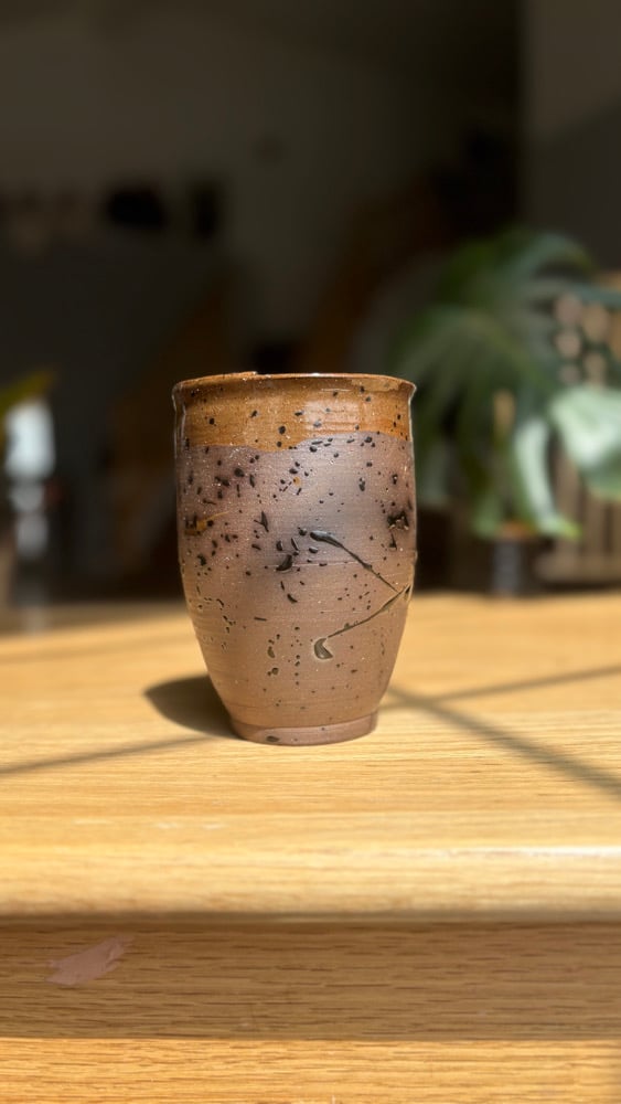 Handmade ceramic cup with lid built on. Microwave and dishwasher safe